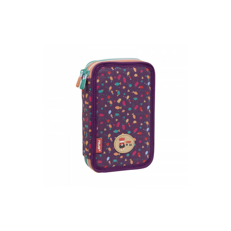 Astuccio a 2 piani con contenuto. Edizione speciale Super Chefs, viola. Contenuto: 2 gomme (4024 e blu Nata), 1 temperamatite AFILA, 1 matita di grafite HB, 1 biro CAPSULE Uno blu, 1 righello da 15 cm, 12 matite colorate triangolari, 18 pennarelli a punta conica. Composizione: esterno in cotone e fodera in poliestere. Dimensioni: 19,5 x 13 x 5 cm.