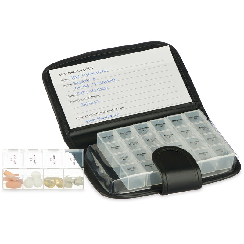 Questo pratico box portapillole ti sarà d'aiuto nella gestione giornaliera dei tuoi medicinali. L'astuccio dispone di 7 scatoline trasparenti per i medicamenti, che possono essere così presi singolarmente. Ognuna di esse è suddivisa in 4 piccole unità per mantenere separate le medicine a seconda dei diversi momenti della giornata (mattina, pomeriggio, sera e notte - in tedesco). Grazie all'elegante astuccio nero con bottone a pressione, i tuoi medicinali rimangono protetti e al sicuro. In caso di emergenze, l'astuccio è dotato di una scheda da compilare con i tuoi dati personali. Attenzione: si prega di lavare il portapillole a mano, in quanto i detergenti e le alte temperature possono, con il tempo, deteriorare la stampa. Astuccio per pillole in dettaglio - Dimensioni totali H x L x P: 3,5 x 19,5 x 13 cm ca. - Dimensioni vaschetta giornaliera H x L x P: 2 x 2,5 x 10 cm ca., 10 g ca. - Dimensioni interne di ciascun piccolo scomparto H x L x P: 1,8 x 2 x 2,4 cm ca. - Peso: 180 g ca.