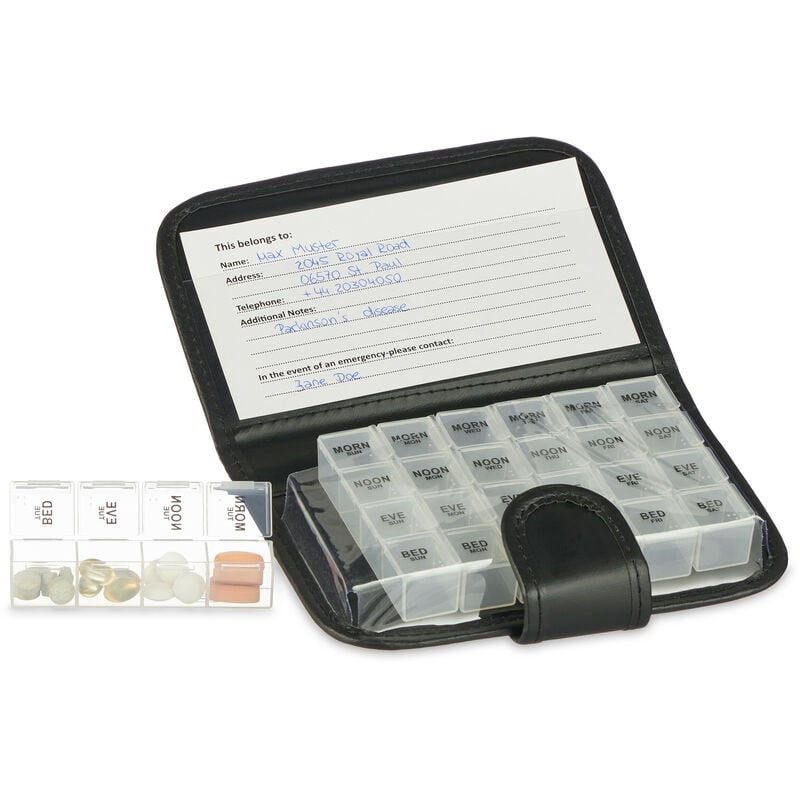 Questo pratico box portapillole ti sarà d'aiuto nella gestione giornaliera dei tuoi medicinali. L'astuccio dispone di 7 scatoline trasparenti per i medicamenti, che possono essere così presi singolarmente. Ognuna di esse è suddivisa in 4 piccole unità per mantenere separate le medicine a seconda dei diversi momenti della giornata (mattina, pomeriggio, sera e notte - in inglese). Grazie all'elegante astuccio nero con bottone a pressione, i tuoi medicinali rimangono protetti e al sicuro. In caso di emergenze, l'astuccio è dotato di una scheda da compilare con i tuoi dati personali. Attenzione: si prega di lavare il portapillole a mano, in quanto i detergenti e le alte temperature possono, con il tempo, deteriorare la stampa. Astuccio per pillole in dettaglio - Dimensioni totali H x L x P: 3,5 x 19,5 x 13 cm ca. - Dimensioni vaschetta giornaliera H x L x P: 2 x 2,5 x 10 cm ca., 10 g ca. - Dimensioni interne di ciascun piccolo scomparto H x L x P: 1,8 x 2 x 2,4 cm ca. - Peso: 170 g ca.