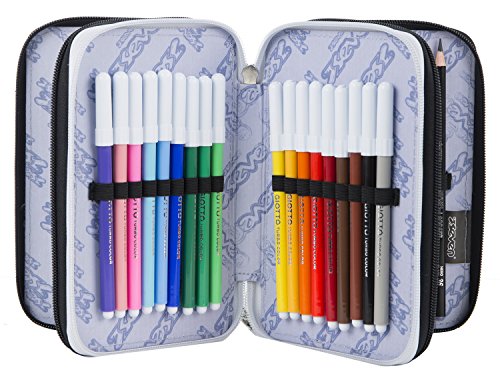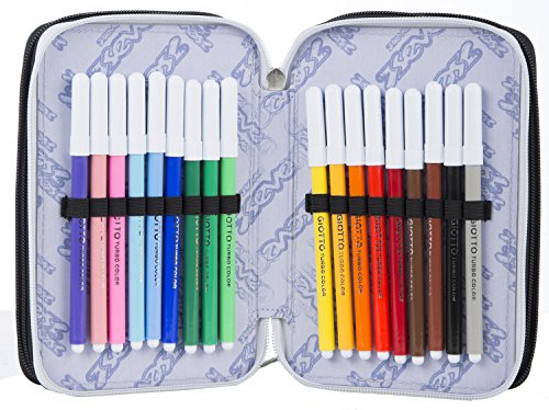 Contenuto: 1 penna a sfera cancellabile, 1 penna a sfera rossa, 1 matita, 1 gomma, 1 temperino, 1 righello, 1 goniometro, 1 forbice, 1 penna a sfera, 18 pastelli giotto, 18 pennarelli