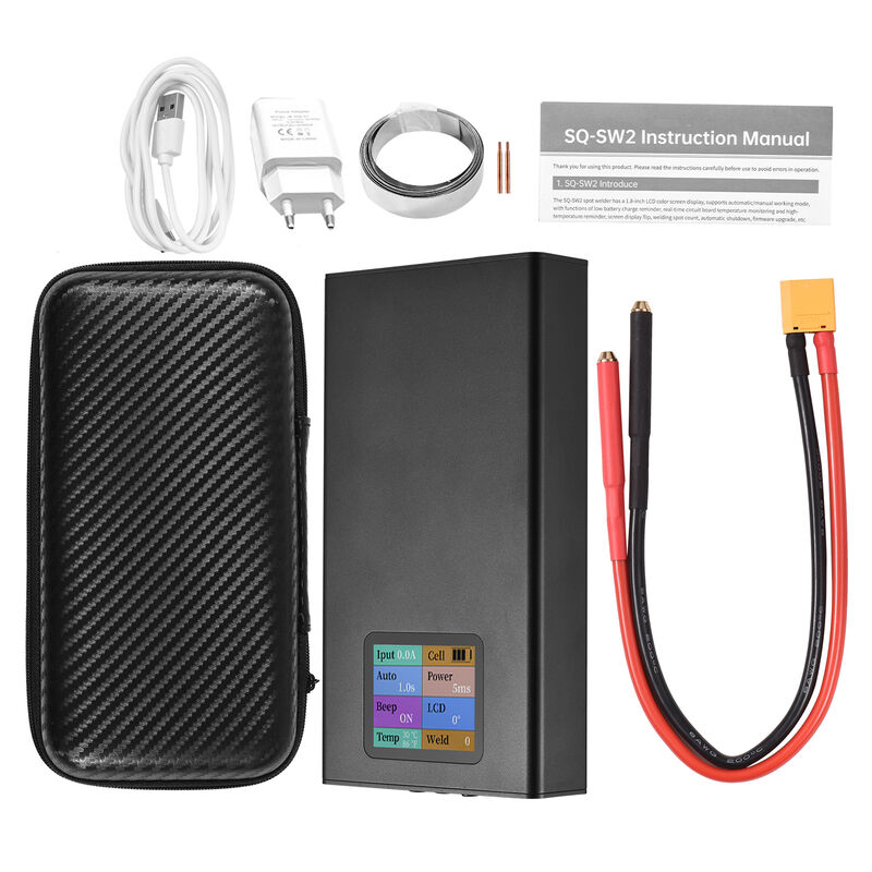 Caratteristiche: Kit di strumenti per saldatura a punti portatile: piccolo e compatto, piccolo come un power bank, facile da trasportare, con una custodia con cerniera per riporlo. 2 modalità di lavoro: supporta la modalità di lavoro automatica e la modalità di lavoro manuale (la modalità manuale viene utilizzata con l'interruttore a pedale), con controllo della temperatura e funzione di protezione e supporta il monitoraggio della temperatura in tempo reale del circuito stampato. Conteggio punti saldatura: con la funzione di conteggio punti saldatura, la saldatura è più precisa e l'effetto è migliore. Strisce di nichel consigliate: supporta la saldatura di nastri nichelati con uno spessore di 0,1 mm-02 mm. Display LCD a colori: il display LCD a colori da 1,8 pollici può visualizzare la corrente in ingresso, la temperatura, la potenza e altri dati. Con funzione di capovolgimento dello schermo. Altre caratteristiche: con funzioni di promemoria di carica della batteria scarica