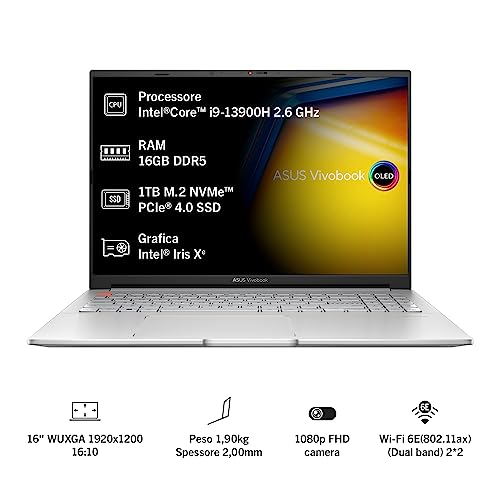 ASUS Vivobook Pro 16 K6602VU#B0C14PL898, Notebook in alluminio 16" Antiglare, 120Hz, Intel Core 13ma gen i9-13900H, RAM 16GB, 1TB SSD PCIE, NVIDIA GeForce RTX™ 4050 6GB, Windows 11 Home, Argento