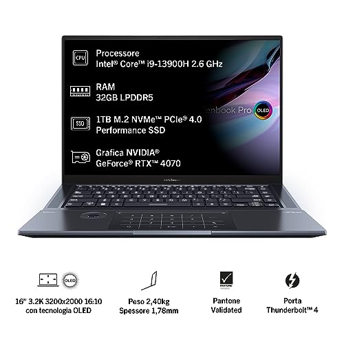 ASUS Zenbook Pro 16X BX7602VI#B0BRY427K6, Notebook 3,2K 16" OLED Glossy touch, 120Hz, Intel Core 13ma gen i9-13900H, RAM 32GB, 1TB SSD PCIE, NVIDIA GeForce RTX 4070 8GB GDDR6, Win 11 Home, Nero