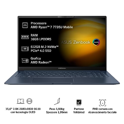 Asus Zenbook 15 OLED UM3504DA#B0C9QBVP7M, Notebook in alluminio, Monitor 15,6" Glossy OLED, AMD Ryzen™ 7 7735U, RAM 16GB, 512GB SSD PCIE, grafica AMD Radeon, Windows 11 Home, Blu