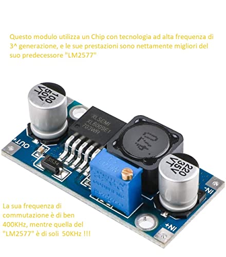 Il modulo XL6009 prende il nome dal suo integrato "MOSFET" di cui è composto. Esso è un componente di ultima generazione che lo porta ad ottenere un'efficienza di più del 94%, inoltre ha una frequenza di commutazione ultra elevata di ben 400 KHz !! (indubbiamente migliore rispetto al suo predecessore la cui frequenza era di soli 50 KHz).