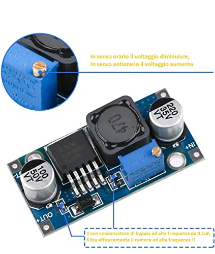Il modulo XL6009 ha un range di tensione output che va da 5 V a 35 V DC, regolabile grazie al potenziometro blu. E la corrente massima utilizzabile è di 4A (più efficiente del suo predecessore "LM2577", che poteva reggere fino a 3A).