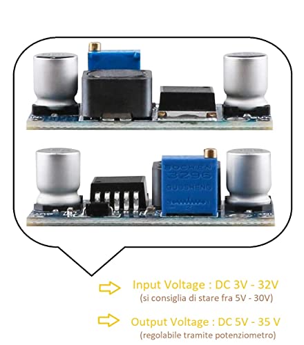 Il modulo XL6009 ha un range di tensione input che va da 3 V a 32 V DC, ma è consigliato restare fra i 5-30 V per evitare possibili danni al modulo.