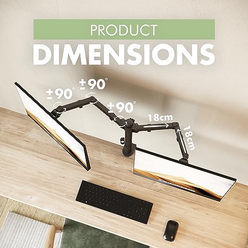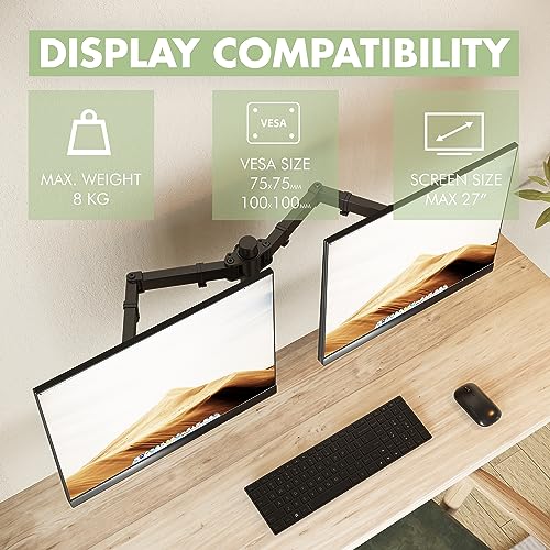 ✅ COMPATIBILITÀ VESA - Supporto per doppio monitor ideale per la maggior parte degli schermi fino a 27 "e 8 kg ciascuno con fori di montaggio posteriori da 75 x 75 mm o 100 x 100 mm. Il nostro braccio per doppio monitor è un buon aiuto per giocatori, designer, programmatori e multitasker.