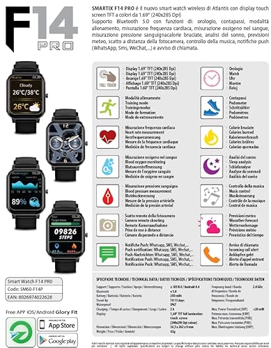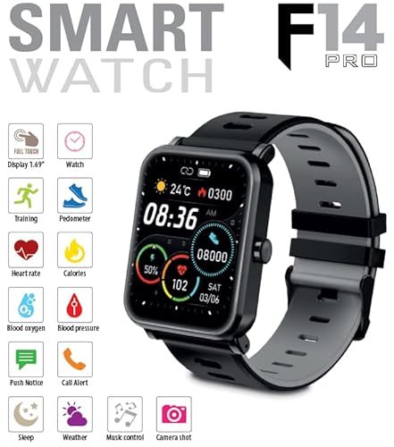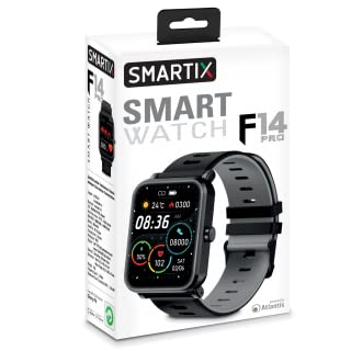 SMARTIX F14 PRO é il nuovo smart watch wireless con display touch screen TFT a colori da 1.69" (240x285 Dpi)Supporto Bluetooth 5.0 con funzioni di: orologio, contapassi, modalità allenamento, misurazione frequenza cardiaca, misurazione ossigeno nel sangue, misurazione pressione sanguignacalorie bruciate, analisi del sonno, previsioni meteo, scatto a distanza della fotocamera, controllo della musica, notifiche push (WhatsApp, Sms, WeChat,...) e avviso di chiamata.