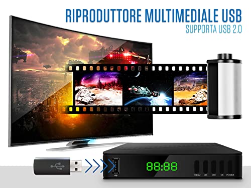 Decoder TV DVB T2 Digitale Terrestre DVBT e DVBT2 HD / Compressione MPEG-2, MPEG-4/H.264, HEVC/H.265 10bit / Sintonia canali automatica e manuale / Registrazione fino a 1000 canali