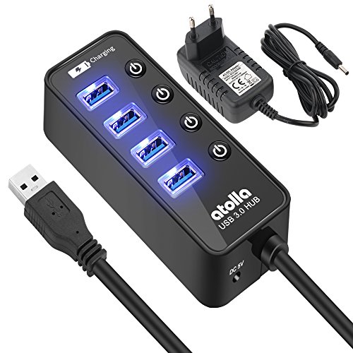 Atolla, hub USB 3.0 attivo con 4 porte USB con interruttore e charging port 2,4 A e adattatore a rete da 15 W (5 V/3 A) USB 3.0 Hub + 5V/3A adapter