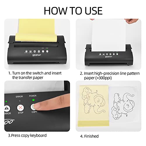 La confezione include 20 fogli di carta di trasferimento formato A4. Con pochi passaggi, è possibile trasferire i vostri disegni preferiti sui fogli di carta di trasferimento e poi tatuarli sulla pelle, risparmiando tempo in modo efficiente.