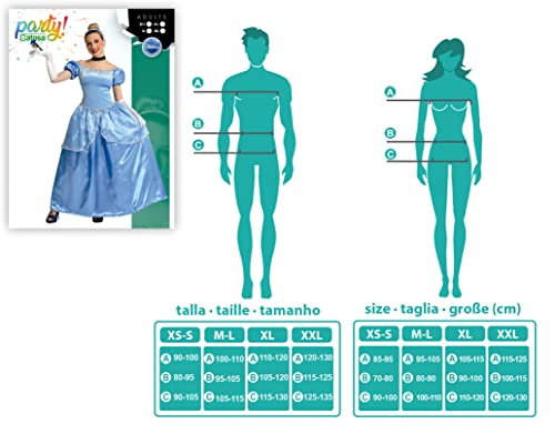 Il costume principessa blu è aderente per un adulto di taglia XS con circonferenza petto da 85 a 95 cm, circonferenza del torace da 70 a 80 cm e circonferenza della vita da 90 a 100 cm.