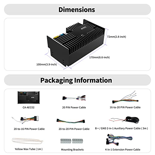 【Dimensioni compatte e installazione semplice】Dimensioni: 6,7"x3,9"x2,8"/172 x 100 x 72 mm (L x P x A). Due metodi di installazione: ① Installare insieme l'autoradio e il CA-AEC02 nella doppia apertura DIN sul cruscotto. ② Installare CA-AEC02 in altri punti come sotto il vano portaoggetti o il sedile del copilota. Il semplice cablaggio a livello di altoparlante non richiede saldature o cablaggi aggiuntivi, evitando il feedback sonoro.