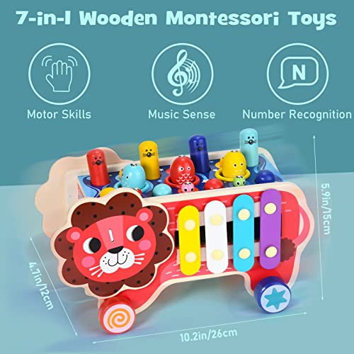 Atoylink 7-in-1 Giochi Montessori in Legno per Bambini Giocattolo Martello Magnetico Pesca Verme Orologio Xilofono Giochi Educativi Regalo di Compleanno per Bambini 1 2 3 4 Anni