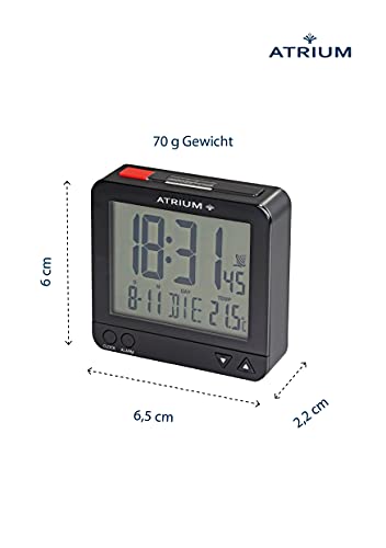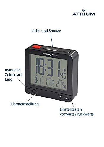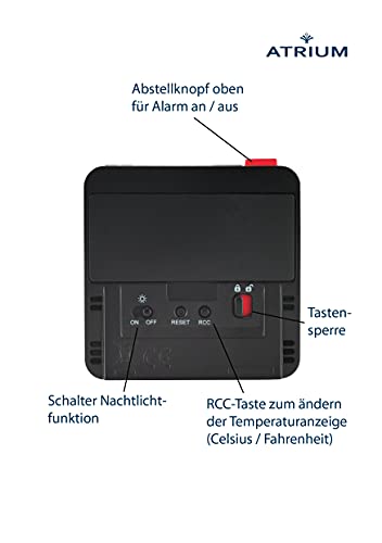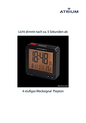 Orologio radiocontrollato DCF con passaggio automatico all'ora legale o invernale. Come sveglia digitale, è completamente silenzioso e quindi senza ticchettio. Un prodotto di qualità del marchio tedesco ATRIUM: affidabile, pratico e solido.