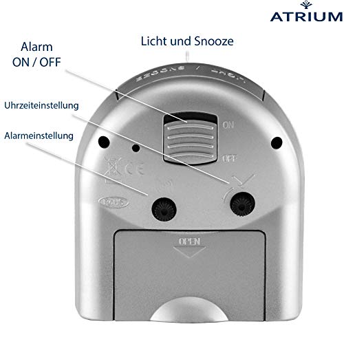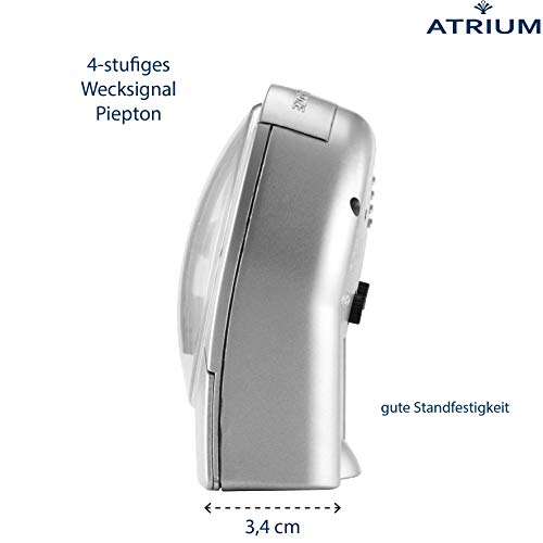 Prodotto di qualità del marchio tedesco Atrium, un classico versatile dal look moderno, che si adatta piacevolmente e discretamente a qualsiasi ambiente abitativo e la forma arrotondata e il vetro curvo lo rendono molto piacevole al tatto, i numeri moderni e molto chiari completano la perfetta forma classica della sveglia