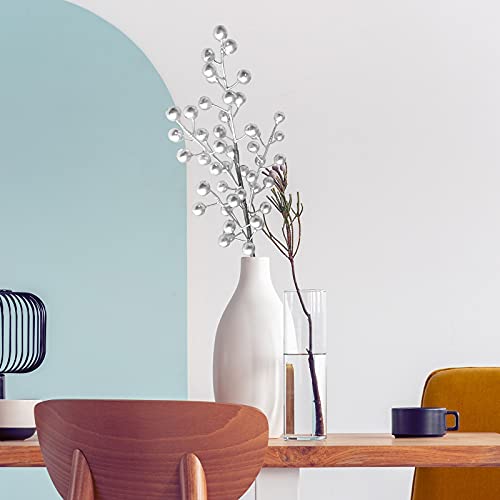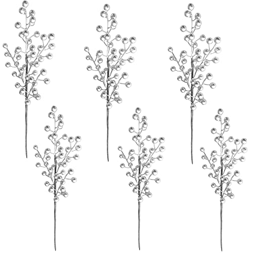 Atroy, 6 steli artificiali in argento con bacche, con glitter natalizi, per decorazioni per albero di Natale, decorazioni per la casa