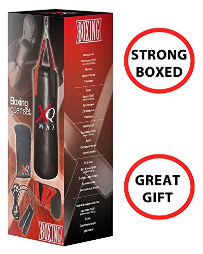 XQ Max set attrezzatura da boxe, sacco riempito compatto da 75 cm, per adulto/ragazzo, 16-17 Kg. Guanti, corda per saltare, gancio da soffitto con bulloni. Kit attrezzatura e accessori per allenamento a casa livello principiante. Colore kit nero/rosso, 2.5FT Boxing Gear Set Black