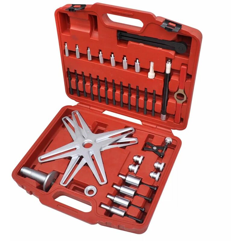 Dimensioni del kit: 47 x 41,5 x 11 cm (L x P x A) Per smontaggio e assemblaggio rapido e professionale di frizioni SAC Ideale per uso professionale e fai da te Struttura resistente Consegnato in una custodia soffiata per un facile trasporto e lo stoccaggio Adatto per i seguenti veicoli: Audi A3, A4, A6, A8 VW Passat, Golf, Sharan, Tiguan Ford Mondeo, S-Max, Galaxy, Transit Mercedes C, E, CLS, S, CLK, SLK, SL BMW 320, 330, 520, 530 Alfa Romeo 147, 159, 166 Fiat Ulysse, Croma, Ducato Lancia Phedra, Thesis Questo set di attrezzi per l'autoallineamento della frizione SAC è stato progettato per i professionisti per montare e smontare velocemente le frizioni SAC. Il set è adatto per quasi tutte le frizioni SAC con 3 e 4 fori della VAG, MB, Opel, Volvo, Renault, ecc. Questo set è indispensabile per le officine meccaniche per professionisti e gli appassionati fai da te. Gli strumenti sono molto resistenti e sono stati lavorati in materiali di alta qualità. Il set è consegnato in una carcassa