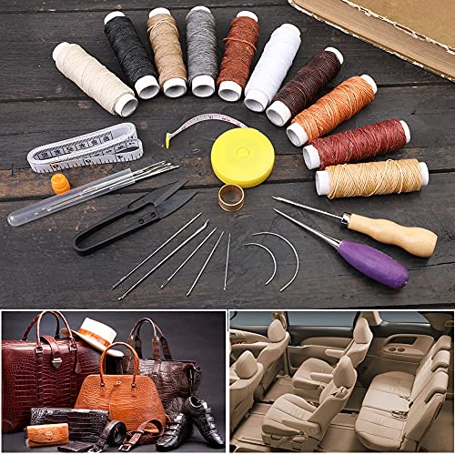 KA MAI KA Set di 32 attrezzi da cucito in pelle, set di attrezzi in pelle con 10 colori di filo di cera in pelle, aghi da cucito a mano, forbici, punteruolo e altri accessori per cucito in pelle