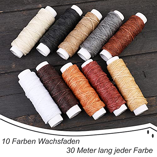 Filo di cera da cucire in pelle: il filo di cuoio cerato è realizzato in materiale di alta qualità, è molto resistente e rivestito in cera, forte e durevole. Ogni filo cerato misura 30 m, 10 colori diversi, abbastanza per soddisfare le vostre esigenze.