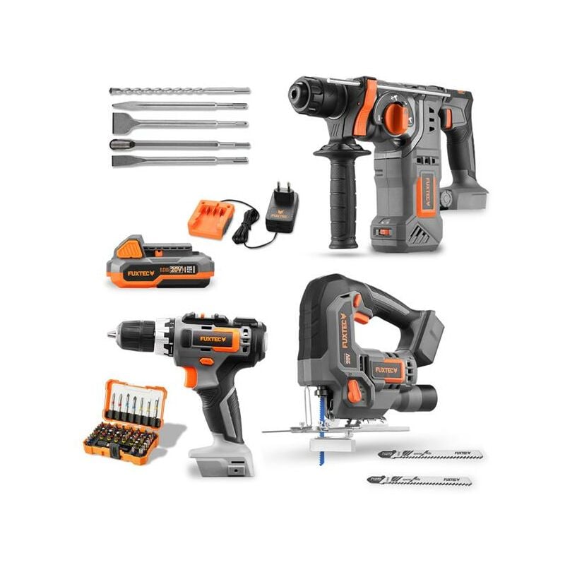 NUOVO Bundle PowerTool con seghetto alternativo, avvitatore a batteria & trapano Martello perforatore il pacchetto completo per ogni appassionato di fai da te Seghetto alternativo a batteria 20V FX-E1JS20 Convincentemente compatto e maneggevole nella forma, il seghetto alternativo a batteria da 20 V di FUXTEC offre proprio quello che fa per voi: un lavoro veloce, semplice e silenzioso senza troppi sforzi. Il nostro sistema " una batteria per tutti" consente un inizio economico e semplice nella tecnologia delle batterie da giardino di FUXTEC. La nostra linea da 20 V comprende un' ampia varietà di attrezzi da giardino, nonché la nostra linea di utensili e utensili elettrici per ogni fai-da-te. Il seghetto alternativo a batteria della nostra linea 20V è maneggevole, particolarmente silenzioso e versatile con una profondità di taglio del legno fino a 40 mm (fino a 3 mm per l' alluminio). A seconda dell' applicazione, l' angolo di taglio può essere regolato in modo flessibile su entrambi i