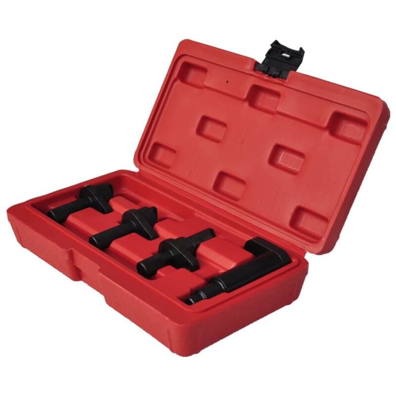Il set di attrezzi è il prodotto ideale per riparazioni di motori professionali, per l'installazione e la rimozione dell'albero a camme, per il cambio della catena di distribuzione, per il controllo e la regolazione della catena di distribuzione etc. Gli attrezzi del nostro set possono essere utilizzati per i seguenti motori: * Adatto al bloccaggio dell'albero a camme e albero motore a 1.2 litri 3 cilindri con 6 or 12 valvole VAG. VW Polo 1.2 liter 6 e 12 valvole, Skoda Fabia 1.2 liter 6 e 12 valvole, Seat Ibiza 1.2 litri 6-valvole, 1.2 litri 12-valvole Seat Cordoba * 2 tempi di bloccaggio albero a camme da usare come OEM T10123, per esempio, motori AZQ, BME e BZG * Bloccaggio albero motore da usare come OEM T10121, per esempio, motori AZQ, BME, BZG, AWY, BMD e BBM * bloccaggio albero a camme da usare come OEM T10120, per esempio, motori AWY, BMD e BBM Tutti i pezzi del Kit sono inclusi in un cofanetto dal facile trasporto. Specificazioni: Utensili inclusi: 4 pz Adatto a motori:1.2