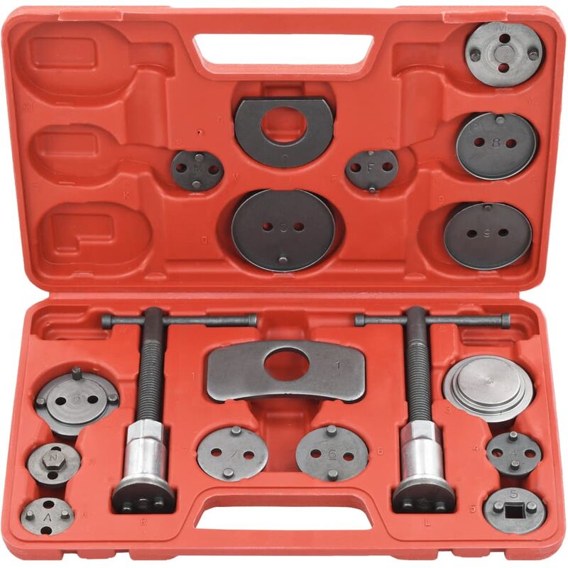 Colore della custodia: Rosso La consegna include una custodia di trasporto La confezione include: 1 Mandrino sinistro 1 Mandrino destro 1 Piastra di ritegno 15 Adattatori per diversi sistemi frenanti 1 Adattatore n. 0 per modelli General Motors, Cadillac Seville, Eldorado 1 Adattatore n. 2 per Citroen XM, Xantia e altri modelli 1 Adattatore n. 3 per Alfa Romeo, Audi, Austin, BMW 318 iS, 320 i, 325 TD, 518 i, 525 i, 740 i, 850 ci, M5, Ford Fiesta, Honda Concerto, Jaguar XJ6, XJ40, Mercedes-Benz 190, 200, 300, 420, 560, Mitsubishi Colt, Nissan Micra, Stanza, Sunny, Range Rover, Toyota Camry, VW Passat, Golf GTI, Volvo 1 Adattatore n. 4 per Alfa Romeo 164 2.0, Fiat, Ford Telstar, Laser, General Motors Saturn, Grand Prix, Lumina, Honda Prelude, CRX, Mazda, Saab 9000, Subaru 1 Adattatore n. 5 con attacco quadrato da 3/8 1 Adattatore n. 6 per Nissan Primera, VW Golf 4 1 Adattatore n. 7 per Audi 80 e 90, V8 e 100, Coupé, Ford Sierra ABS, Granada e Scorpio dal 1985, Honda Prelude, Nissan
