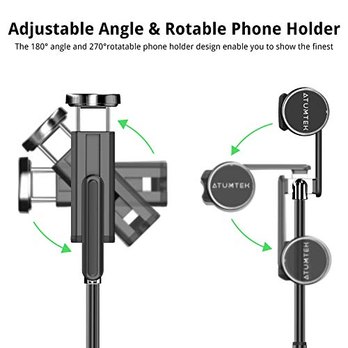 ⭐ [Staffa Regolabile & Supporto per Telefono Ruotabile a 270°] - Il Bastone dei Selfie Bluetooth ATUMTEK adotta un design con Supporto per Telefono Ruotabile a 270° compatibile con il supporto del telefonino e la staffa ruota orizzontalmente e verticalmente. La staffa regolabile di 180° ti consente di selezionare l'angolatura perfetta quando scatti foto/video. Il supporto per telefono sostiene telefoni con larghezza massima di 8.69 cm(3.42 pollici).)