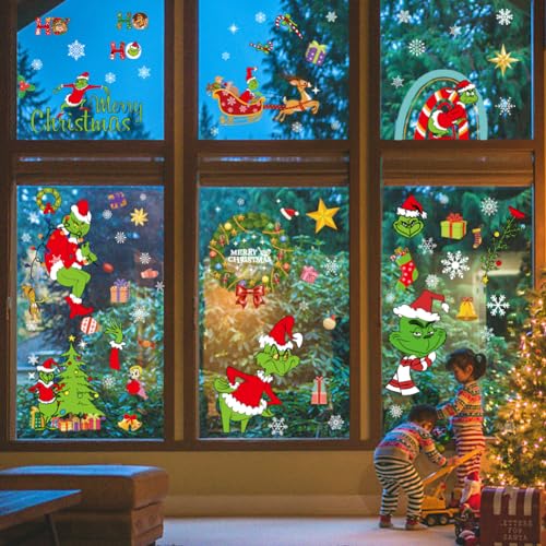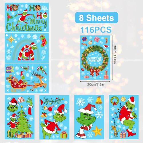 AUAUY Christmas Window Stickers, 8 Sheets 116pcs Grinch Merry Christmas Window Clings Sticker, Adesivi Adesivi Vetro Natalizi, PVC Autoadesivi Finestre, Adesivi Vetrina Finestra Decorazione
