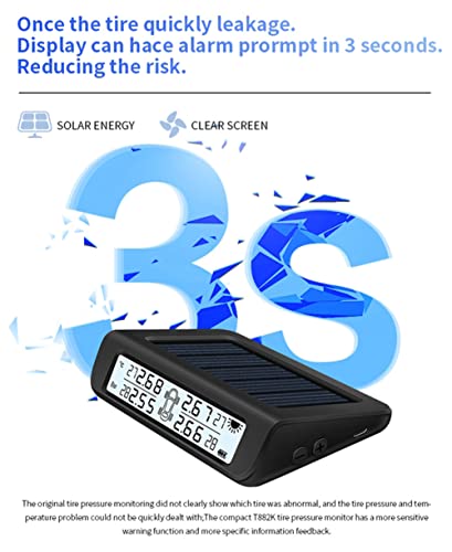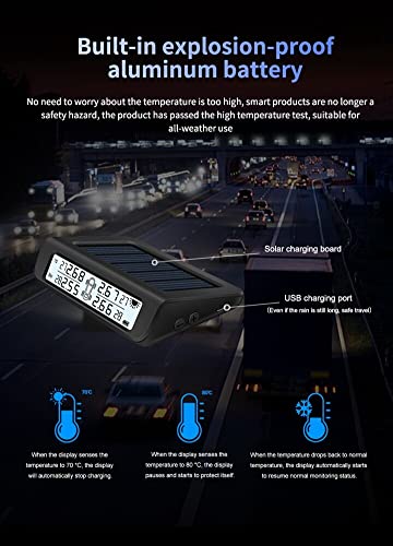 Ricarica solare e USB: supporta la ricarica del cavo USB di tipo C e la ricarica solare per garantire che il sistema di monitoraggio della pressione dei pneumatici continui a funzionare e non occupi la presa dell'accendisigari dell'auto.