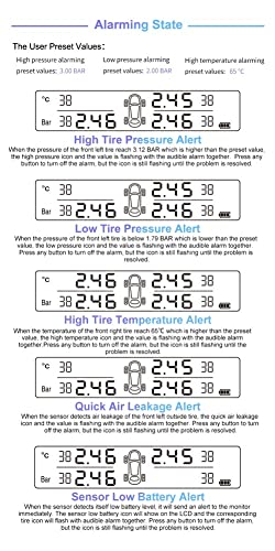 Ampia applicazione: il sistema di monitoraggio della pressione dei pneumatici per autoveicoli è adatto per un intervallo di pressione dei pneumatici per autoveicoli inferiore a 8 bar, come autovetture, fuoristrada, veicoli commerciali, MPV, SUV, minivan, camion, ecc.