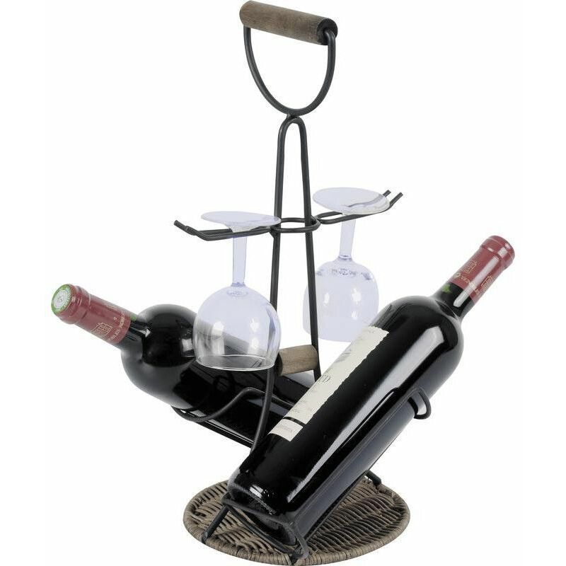 Aspect: Coloris: Gris Matériau principal: Métal Matériaux secondaires: Rotin Dimensions: Hauteur (en cm): 41,00 Longueur (en cm): 23,00 Profondeur (en cm): 18,00 Autres caractéristiques: Capacité: 2 bouteilles et 2 verres (non inclus) Poids (en kg): 0,60 Porte-bouteilles & verres En Métal et Rotin (L)23x(P)18x(H)41cm
