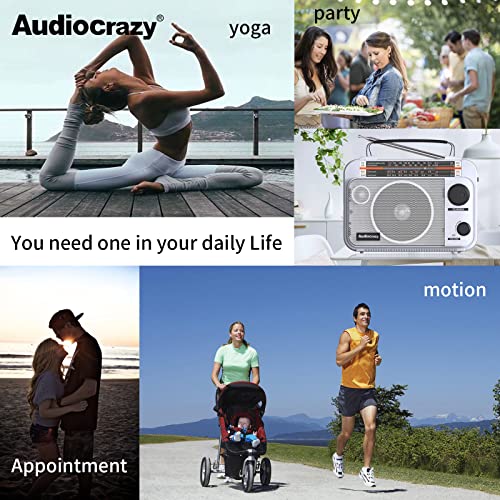 Audiocrazy Radio Portatile AM/FM/SW1-2 Multibanda Radio con Batteria Ricaricabile da 1800 mAh, Cavo AC o Radio FM Portatile a Pile, Altoparlanti,Jack Per Cuffie, Ingresso AUX Bianco