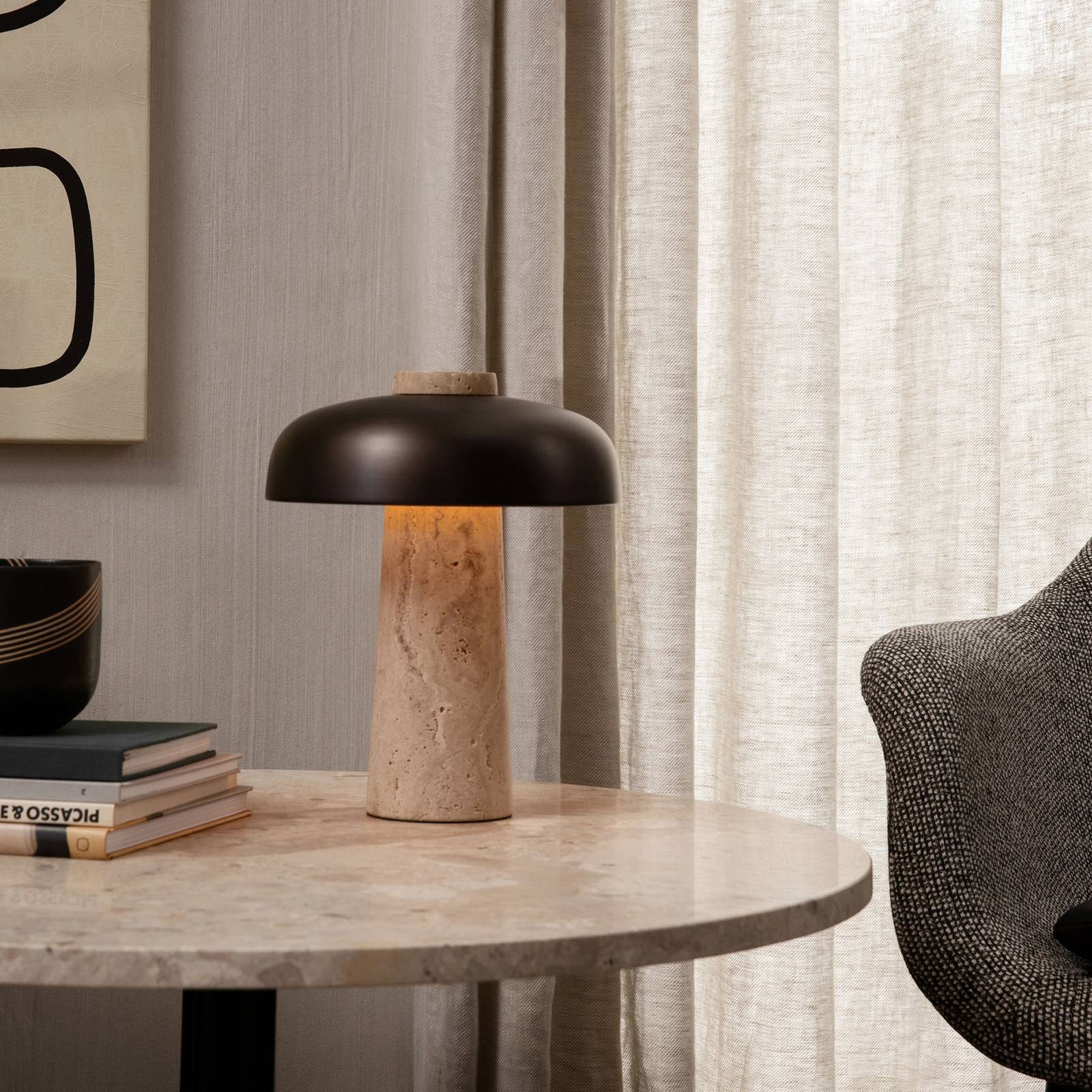 Lampada da tavolo a LED Reverse con base in travertino e dimmerLa base conica della lampada da tavolo a LED Reverse è realizzata in travertino non trattato. I LED che brillano verso il basso nel paralume in alluminio bronzato illuminano efficacemente la pietra e sottolineano in modo particolare la struttura della pietra grezza;
