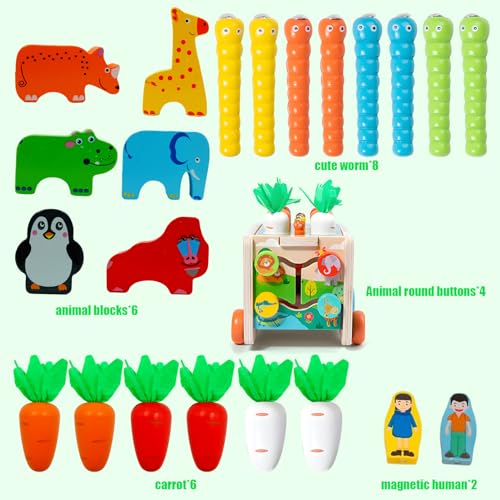 Giocattoli sensoriali multifunzionali in legno per bambini - Il carrello multifunzionale del frutteto include oggetti dal design intelligente, tra cui 2 bambini, 6 carote, 8 vermi e 10 animali disposti su una macchinina. Si può giocare a tirare le carote e a catturare gli insetti, oppure si può giocare a impilare gli animali e a fare puzzle per portare a casa gli animaletti o a giocare con il carrello.