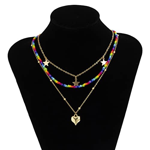 Aukmla Boho Star - Collana girocollo con ciondolo a forma di cuore in oro, collana con perline colorate per donne e ragazze (confezione da 3)