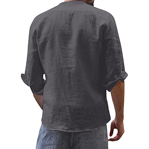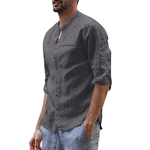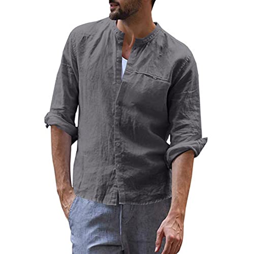 AUMELR Camicie da uomo a maniche lunghe in lino senza colletto abbottonato Henley camicie, Grigio, 3XL