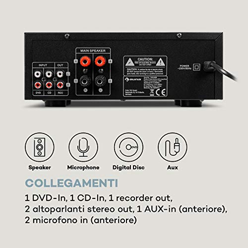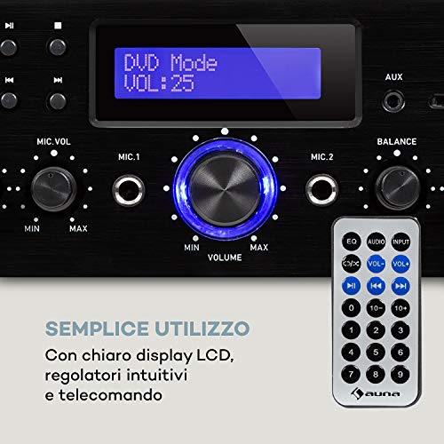 Auna AMP-5 BT - Amplificatore HiFi, Bluetooth, Potenza di Uscita: 2 x 50 Watt RMS, USB/SD, AUX-in, Dvd-in, CD-in, 2 Connessioni Microfono, Uscita Recorder, Display LED, Telecomando, Nero
