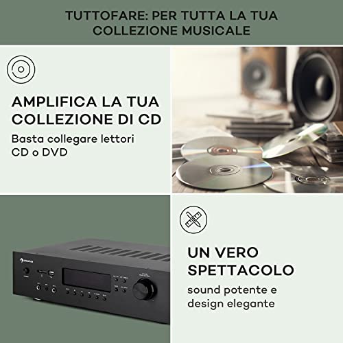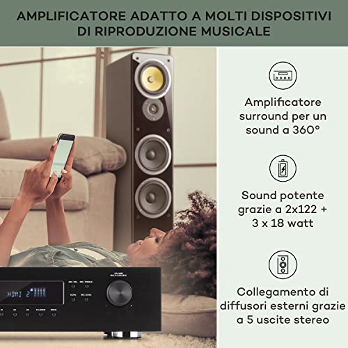 AUNA AMP-H260 5.1 - Amplificatore Receiver Equalizzatore, 2x100 Watt + 3x20 Watt RMS, Bluetooth, Porta USB, Slot SD, Digital-In Ottico & Coassiale, 2 x HDMI-In/1 x HDMI-Out, Nero