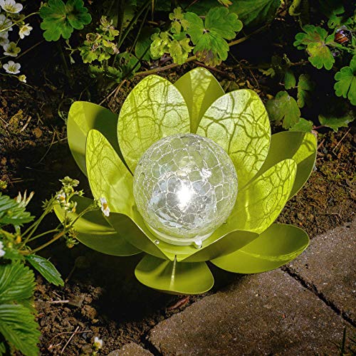 Auraglow Lanterna a LED da Giardino Alimentata a Luce Solare in Metallo & Vetro Fiori di Loto da Acqua e Lilla Lampada da Tavolo per Esterni - Verde
