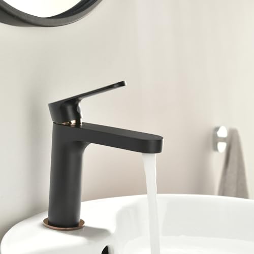 【DESIGN UNICO E MODERNO】Le finiture in nero e oro rosa aggiungono un tocco di calore e glamour al bagno, evitando la monotonia. Si adatta bene sia al design moderno che a quello tradizionale. Aggiornate il vostro bagno con questo rubinetto bagno bello e funzionale che offre prestazioni affidabili e manutenzione minima.