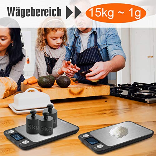 Misurazione precisa: il campo di pesatura della bilancia elettronica da cucina è da 1 g a 15000 g e la precisione di misurazione può raggiungere 1 g. Può misurare tutti gli oggetti come frutta e verdura, farina, acqua, latte, ecc.