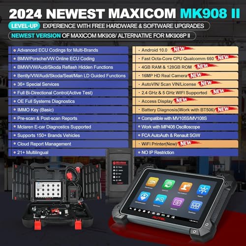 【2024 PIÙ RECENTE MAXICOM MK908 II, AGGIORNAMENTO DI MK908】Vuoi massimizzare produttività per far crescere affari? Aggiornato da MK908, vanta una velocità diagnostica 5 volte più veloce: sistema operativo Android 10 più veloce e più stabile, CPU Qualcomm 660, WiFi a 5 GHz, memoria più grande da 128 GB, enorme batteria da 15000 mAh. Inoltre, 2024 MK908 II adotta la tecnologia più recente: Auto Scan 2.0, realizzando la scansione in pochi secondi. 5 volte più veloce dei concorrenti!