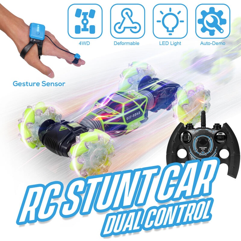 Blu Velocità: 18 km/h Frequenza: 2,4 G Distanza telecomando: 40-50 m Batteria per auto: 6V 600mAh Tempo di ricarica: 2,5-3 ore Orario di lavoro: 15-20 minuti Batteria per telecomando: 2* AA (non inclusa) Batteria per orologio: 3,7 V 200 mAh Dimensioni del prodotto: modalità piatta: 33*17,5*8,5 cm, modalità fuoristrada: 26,5*17,5*12 cm Peso: 838 g Nota: * Potrebbero esserci alcune deviazioni dovute alla misurazione manuale o lievi differenza di colore dovuta alle condizioni fotografiche. Grazie per la tua comprensione. > Peso della confezione: 1216 g Confezione regalo Elenco dei pacchetti: 1* RC Stunt Car 1* Telecomando 1* Orologio con rilevamento dei gesti 1* Batteria