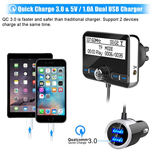 【 Dual USB Charger & chiamate a mani libere 】 con uscita 2USB. USB1 - 5 V/1 A e usb2-qc3.0. Porte di ricarica USB offre una velocità di ricarica più veloce e stabile. È possibile caricare il telefono e tablet allo stesso tempo.Costruito in microfono con, il trasmettitore FM supporta One Touch per rispondere alle chiamate e collegamento. Inoltre, la funzione intelligente CVC cancellazione del rumore rende le chiamate più chiara. Sarà sicuro per voi durante la guida