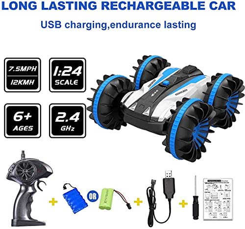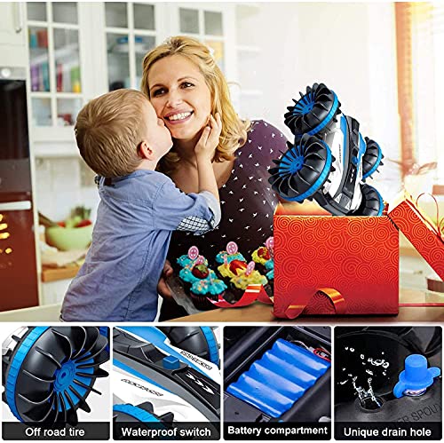 Auto Telecomandata Anfibia per Bambini, Barca per auto RC Acrobatica Impermeabile 4WD 2,4 Ghz con camion RC a Rotazione e Ribaltamento a 360 °, Regali di Compleanno di Natale (Blue)