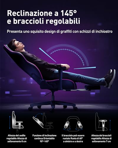 AutoFull Graffiti Sedia da Gaming con Poggiapiedi,Sedia da corsa in pelle super morbida PU resistente all'usura regolabile a dondolo con ricamo di supporto lombare e poggiapiedi, viola