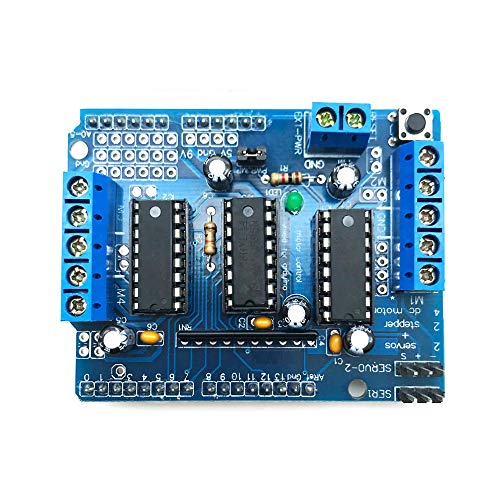 It can control 4 DC motors or 2 stepper motors. It also has 2 power connectors. It fits directly without tinkering on an Arduino UNO, Duemilanove or MEGA.